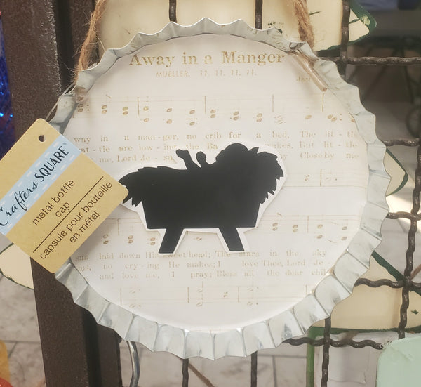 Celebrate the true meaning of Christmas with this beautiful “Away in a Manger” wall hanging, featuring a silhouette of baby Jesus in a manger over vintage-style sheet music. Crafted inside a rustic metal bottle cap frame, this nativity Christmas décor brings a touch of faith and farmhouse charm to your home. Perfect for holiday wall décor, Christian gifts, or rustic Christmas ornaments, this handmade Away in a Manger sign reminds all of the peaceful joy of the season. Ideal for mantels, entryways, or tree decorations.