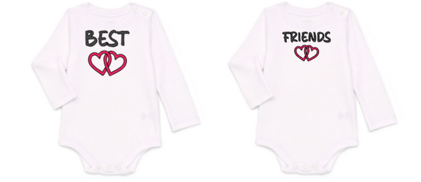 Adorable matching “Best Friends” twin onesie set for your inseparable duo! Each bodysuit features a cute heart design — one says “Best” and the other “Friends.” Made from soft, breathable cotton with snap closures for easy changes. Perfect twin outfit gift for baby showers, newborn photos, or everyday twin cuteness!