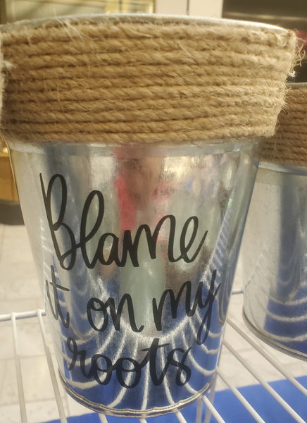 - "Funny Metal Plant Pot – ‘Blame It On My Roots’ – Rustic Jute-Wrapped Planter for Succulents, Herbs & Plant Lovers"