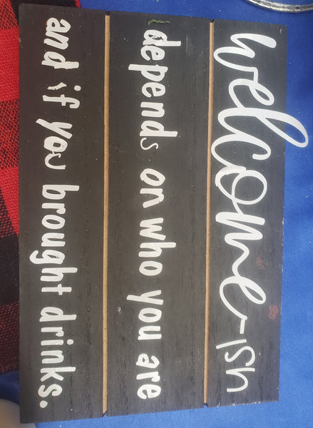 - "Funny Welcome Sign – ‘Welcome-ish Depends on Who You Are & If You Brought Drinks’ – Rustic Wood Decor for Entryway, Porch, or Bar"