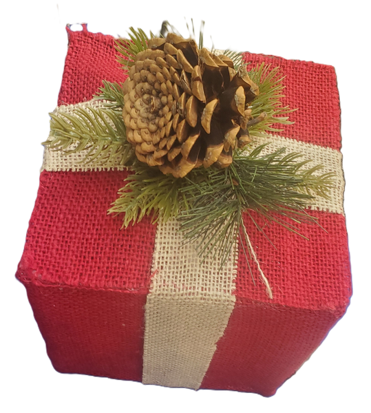 Add rustic elegance to your holiday decor with this handmade Christmas gift box, wrapped in red burlap and topped with a pinecone and evergreen sprigs. Hidden lights inside create a warm, festive glow—perfect for tabletops, mantels, or under the tree. A beautiful blend of texture, tradition, and seasonal sparkle.