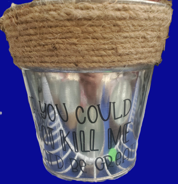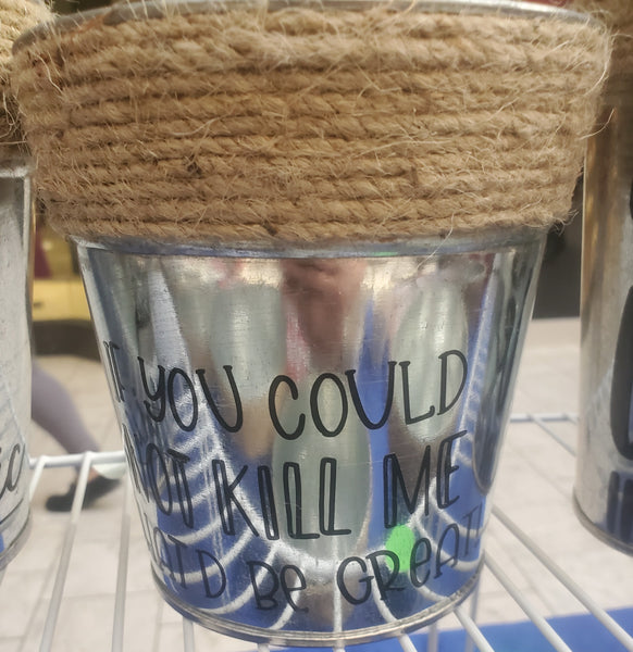 Keep your plants alive—and your sense of humor thriving—with this funny metal plant pot featuring the cheeky phrase “If You Could Not Kill Me That’d Be Great.” Wrapped in rustic jute at the top, this stylish and sarcastic planter is perfect for succulents, cacti, or low-maintenance houseplants. A great gift for plant lovers, coworkers, teachers, or anyone with a not-so-green thumb, this pot adds personality to any office desk, windowsill, or home decor. Whether you're shopping for a birthday, farewell gift, or just want to make someone laugh, this humorous plant pot is a witty way to say “I believe in you… kinda.”