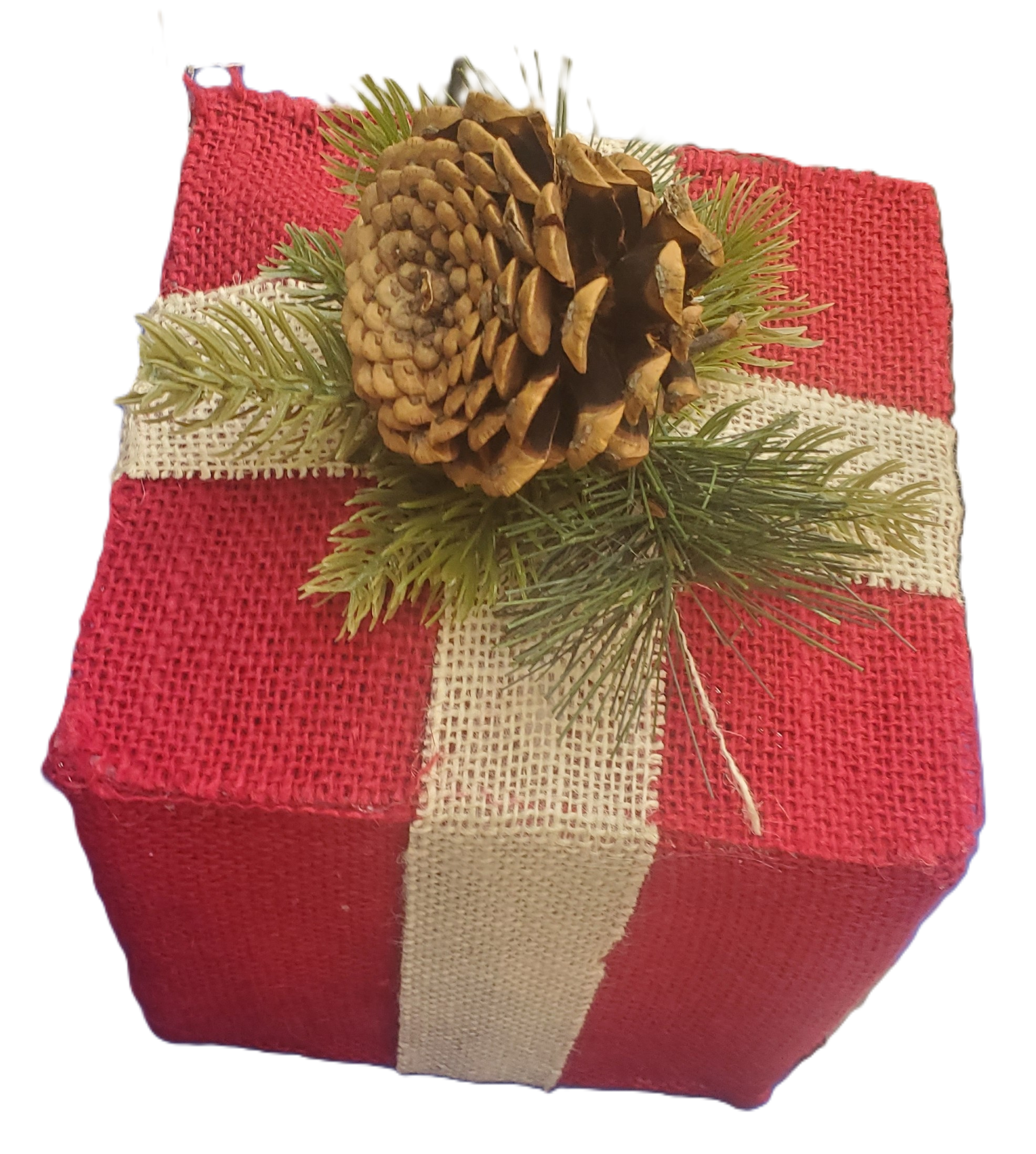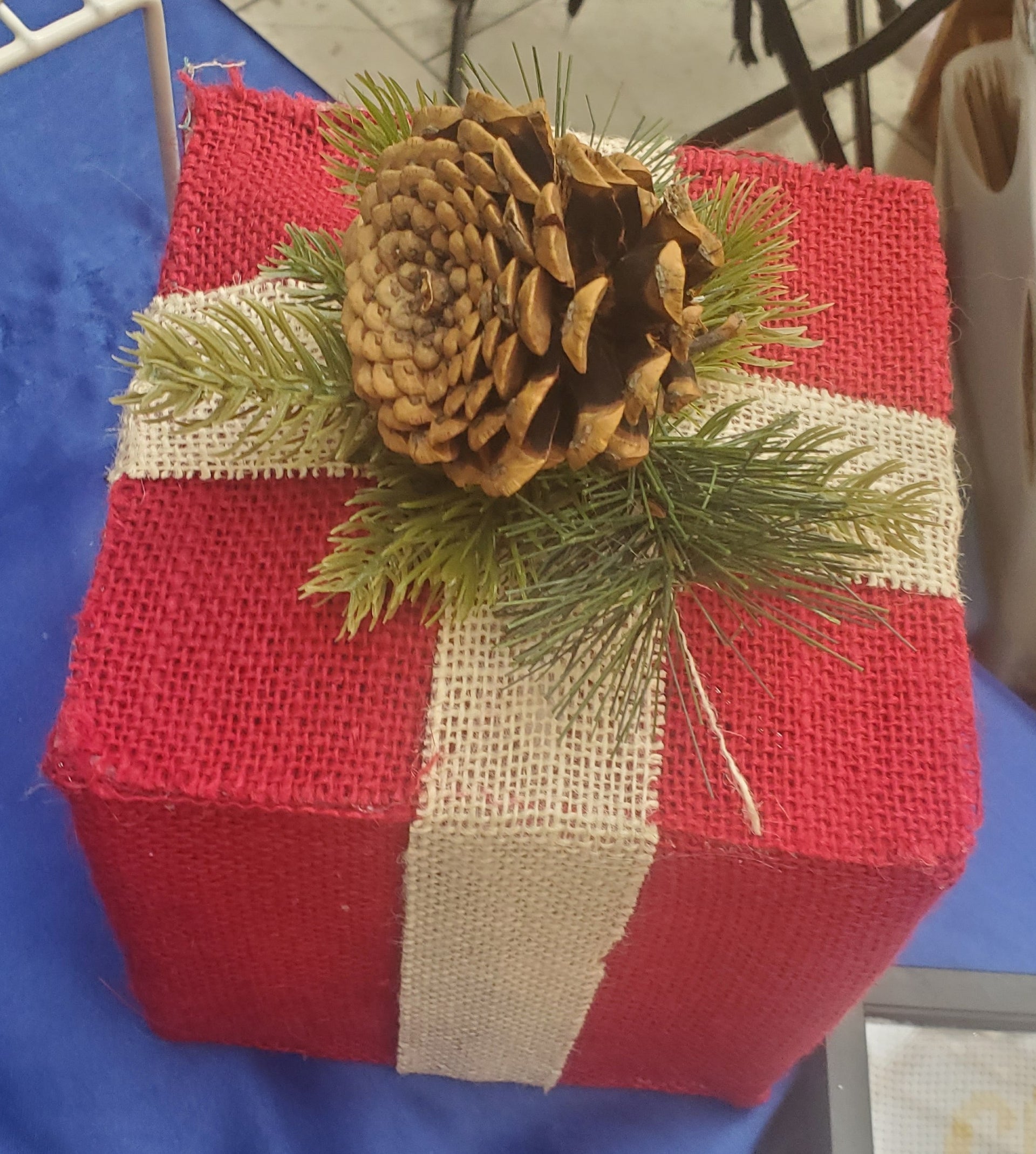 Add rustic elegance to your holiday decor with this handmade Christmas gift box, wrapped in red burlap and topped with a pinecone and evergreen sprigs. Hidden lights inside create a warm, festive glow—perfect for tabletops, mantels, or under the tree. A beautiful blend of texture, tradition, and seasonal sparkle.