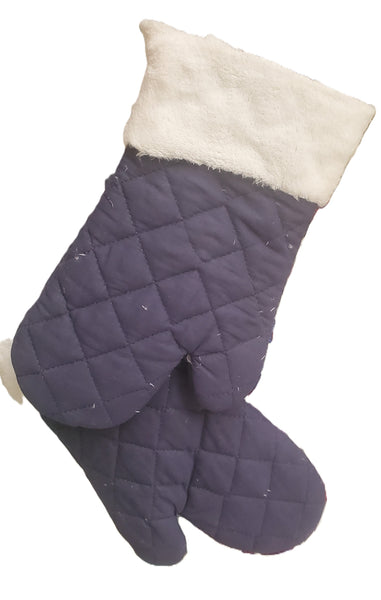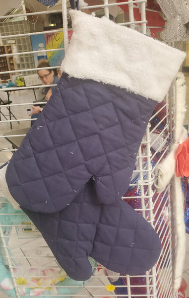 Each set features dark blue quilted cotton mitts with a classic diamond stitch pattern and crisp white cuffs, evoking the nostalgic feel of winter wear. Hung together in a playful arrangement, these repurposed oven mitts transform into a delightful winter mitten garland, ideal for Christmas kitchen decor, country-style homes, or handmade gift ideas.
