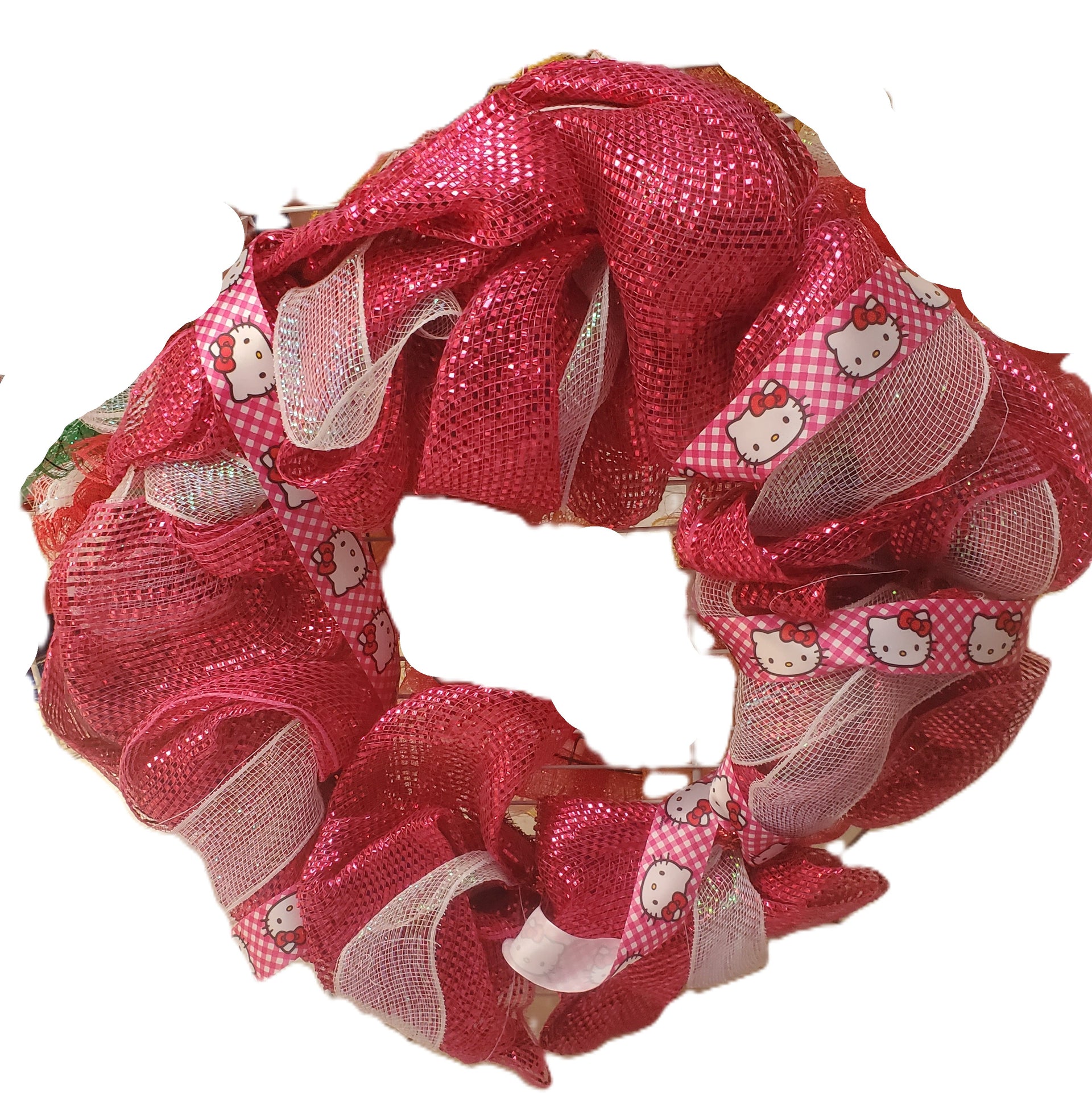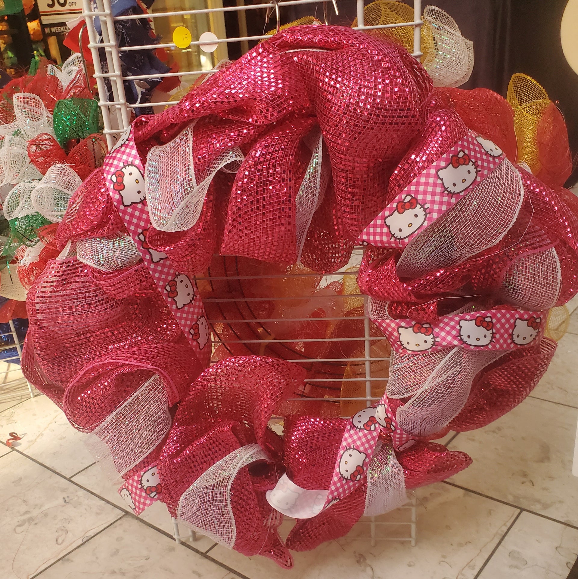 - Hello Kitty Wreath – Pink Mesh Ribbon Wreath with Hello Kitty Bow | Cute Girls Room Door Décor, Birthday Party, Nursery Decoration