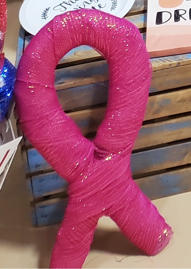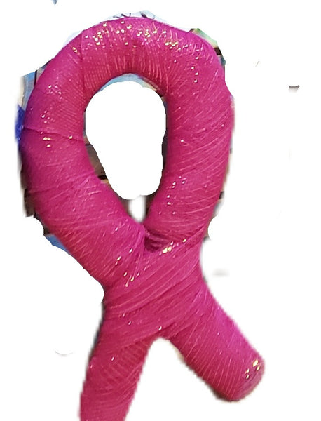 Beautiful handmade pink breast cancer awareness ribbon décor wrapped in glittery pink fabric. Perfect as a breast cancer support gift, pink ribbon wreath, or fundraising display. Show hope, strength, and awareness with this sparkly pink ribbon decoration — ideal for home, office, or charity events.
