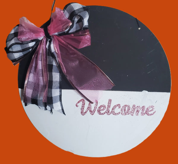 Greet guests in style with this handcrafted welcome sign, featuring a glittery pink script on a black-and-white round base. Topped with a layered ribbon bow in plaid, sheer, and solid pink, this lightweight piece is perfect for front doors, entryways, or gift-giving. Easy to hang and full of charm, it adds warmth to any space.