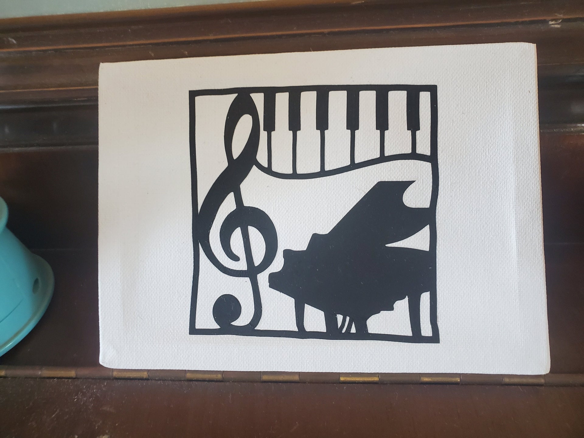 Black vinyl ironed on to a white canvas for long lasting decor. Perfect for music room, office or house. Also makes a wonderful gift for music teacher or musician. My niece picked this as her favorite piece for their music room!