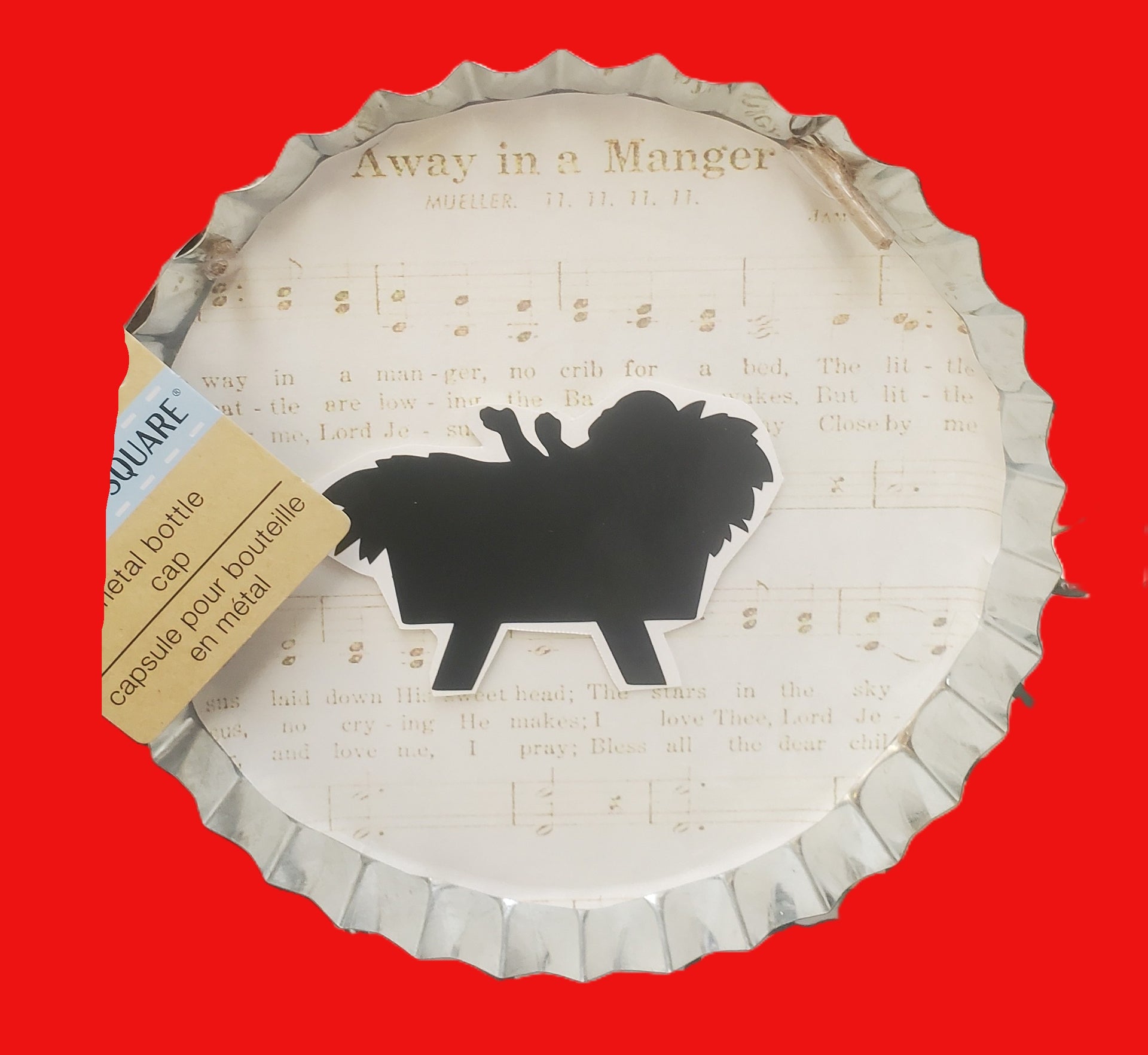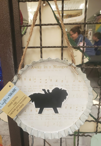 Celebrate the true meaning of Christmas with this beautiful “Away in a Manger” wall hanging, featuring a silhouette of baby Jesus in a manger over vintage-style sheet music. Crafted inside a rustic metal bottle cap frame, this nativity Christmas décor brings a touch of faith and farmhouse charm to your home. Perfect for holiday wall décor, Christian gifts, or rustic Christmas ornaments, this handmade Away in a Manger sign reminds all of the peaceful joy of the season. Ideal for mantels, entryways, or tree decorations.