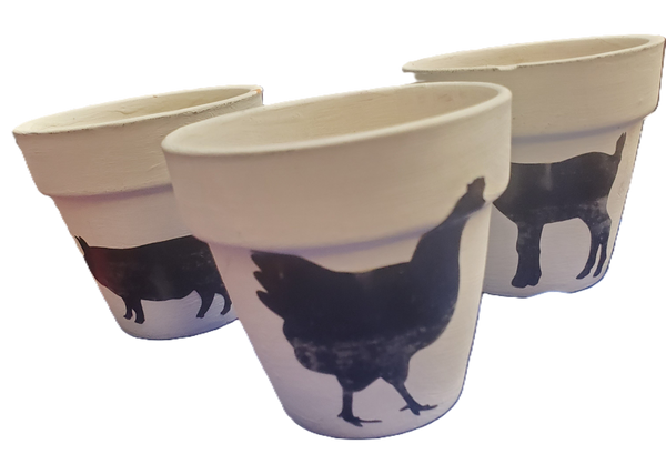 Bring a touch of the farm to your home or garden with these handcrafted small clay plant pots featuring charming silhouettes of a chicken, pig, and goat. Perfect for succulents, herbs, or small houseplants, these rustic terracotta planters add personality and warmth to any space. Ideal for farmhouse decor, country kitchens, or garden-themed gifts, these mini pots make thoughtful presents for gardeners, animal lovers, teachers, and coworkers. Whether you're decorating a windowsill or gifting a piece of the homestead, these farm animal clay pots are a delightful way to root your style in nature.