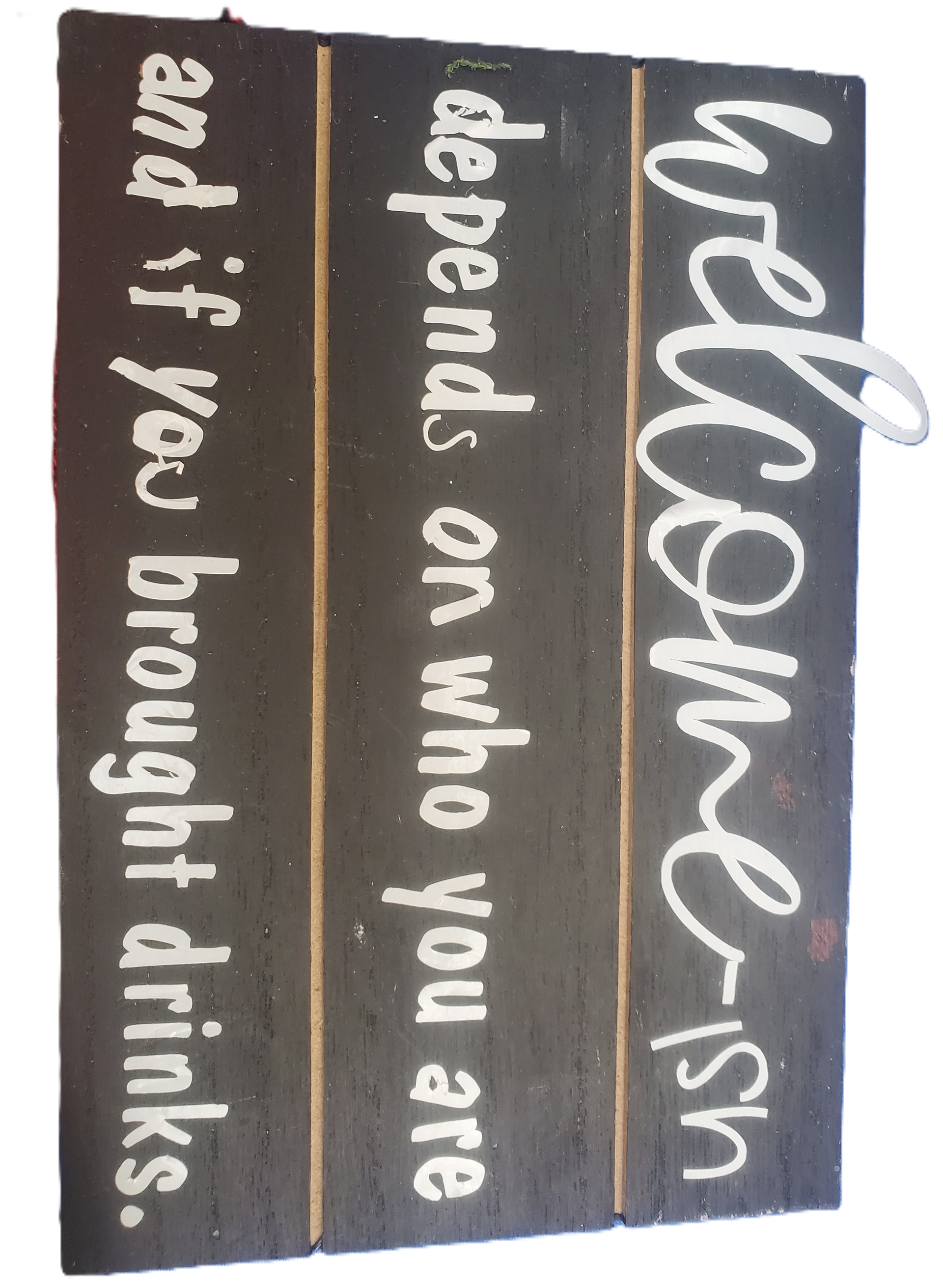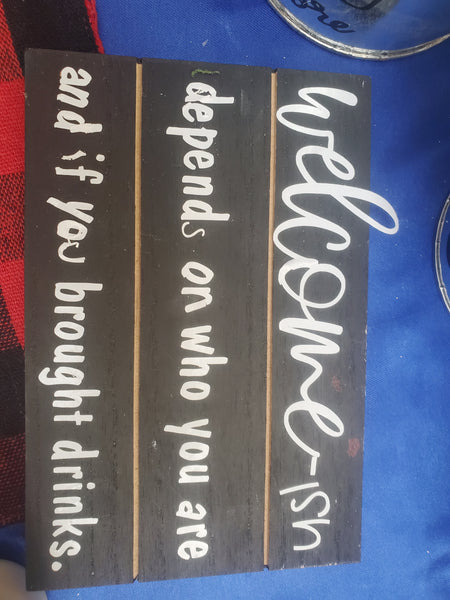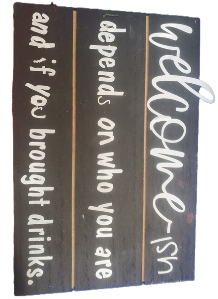 - "Funny Welcome Sign – ‘Welcome-ish Depends on Who You Are & If You Brought Drinks’ – Rustic Wood Decor for Entryway, Porch, or Bar"