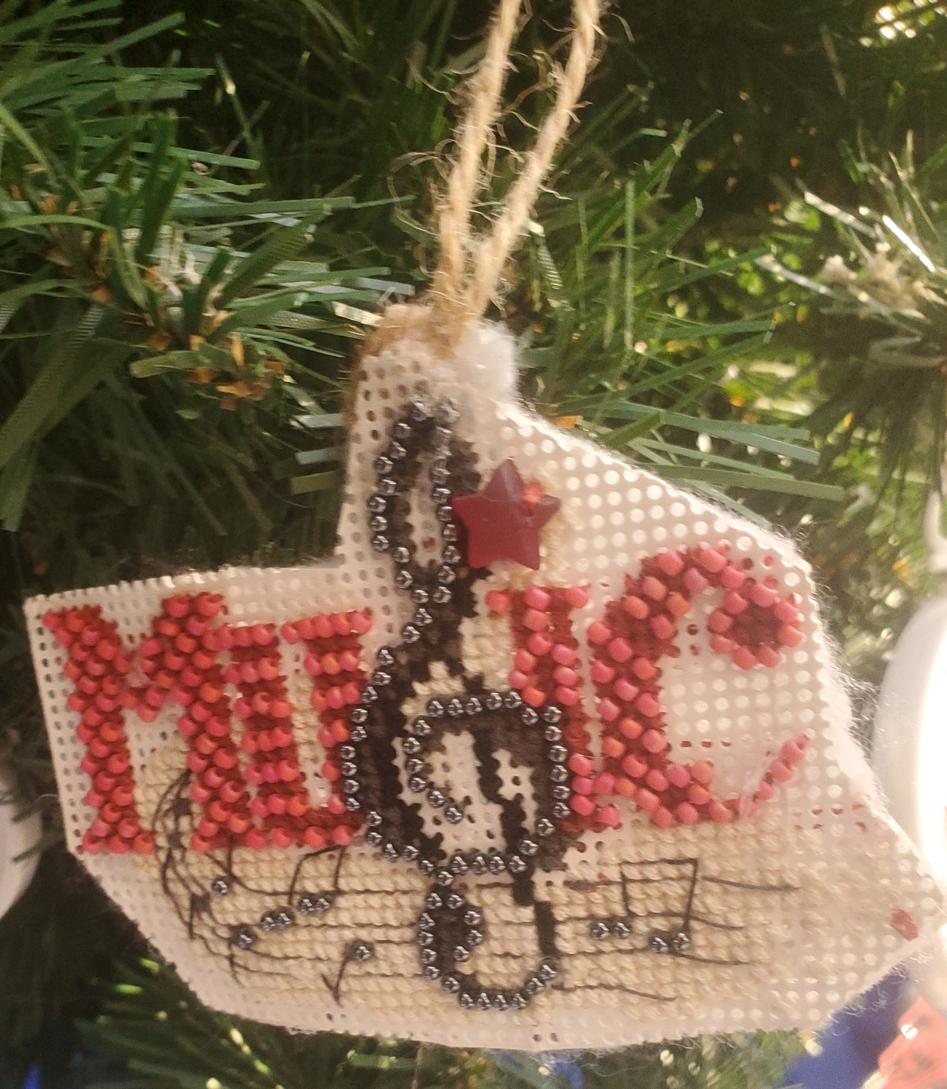Handmade Music Christmas Ornament – Cross-Stitch Treble Clef Design | Music Lover Gift | Paper Canvas Holiday Decor | Red & Black Musical Tree Decoration