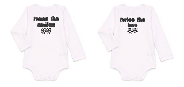Celebrate your little duo with our “Twice the Smiles, Twice the Love” complimenting twin baby onesies, t-shirts, hoodies, or sweatshirts! This adorable long or short sleeve bodysuit in your choice of color set features a design that compliments each other — perfect for twin boys or girls. Made from soft cotton for comfort and easy snap closures for quick diaper changes. Ideal twin baby shower gift, newborn photo outfit, or everyday matching twin look!