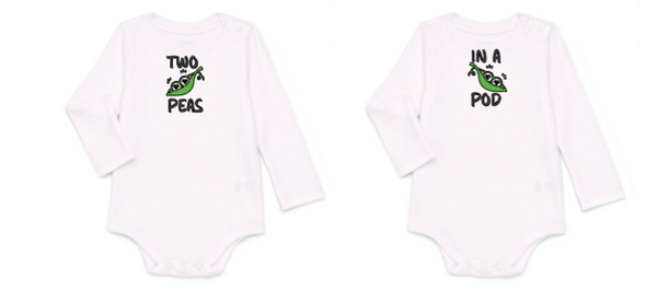Celebrate your little duo with our “Two Peas in a Pod” complimenting twin baby onesies, tshirt, hoodie, or sweatshirt! This adorable long or short sleeve bodysuit in your choice of color set features a design that complete each other — perfect for twin boys or girls. Made from soft cotton for comfort and easy snap closures for quick diaper changes. Ideal twin baby shower gift, newborn photo outfit, or everyday matching twin look!